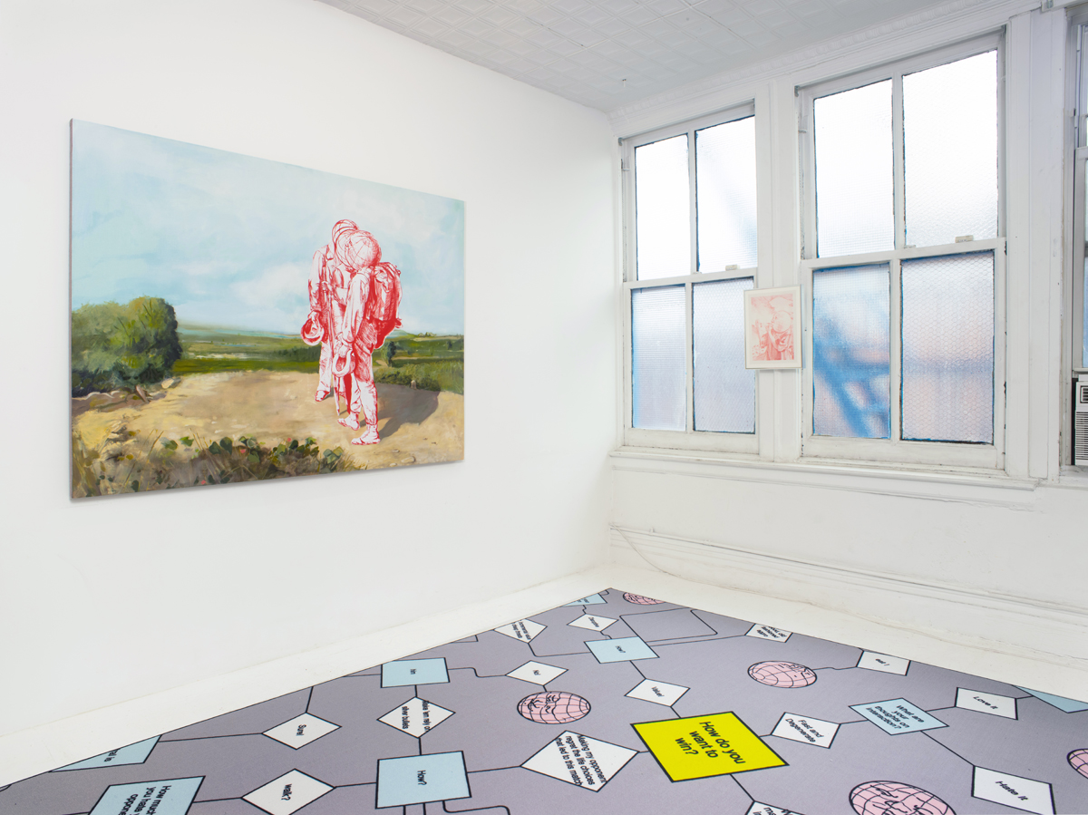 The marquee motif of David Muenzer’s New York debut may strike you as almost goofy: in one painting and a suite of vibrant, deft figurative drawings in red pencil, he has transformed the head of each of those depicted into a globe, inscribed with contour lines as if out of an art textbook. The figures vary in demeanor and garb, as do the scenes they inhabit, and their too-small faces fit onto the spheres awkwardly—recessed like depressions on an underinflated basketball, poking out like Groucho Marx schnozz-and-glasses. The most contemporary of them confronts us in a selfie, phone propped improbably on the floor with their Air Jordan Mid thrust up practically against the lens. Another meets our gaze languorously as she reclines on a carpeted floor. A third, who seems a child or young adolescent, poses awkwardly as she examines her image on a laptop screen: the twenty-first century’s mirror-stage, checking one’s looq before a video chat. The visitor to the exhibition takes all this in while standing atop one more work, a gray industrial carpet patterned with pink, yellow, and light blue geometrical shapes. It depicts a conflict-themed tactical flowchart that flows nonsensically in every direction. A sample question: “How do you want to win?” One of the more cogent responses: “Making my opponent regret the life choices that led to this match.”
