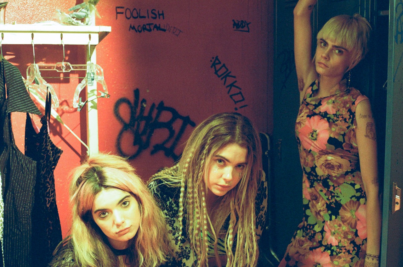 Dylan Gelula, Ashley Benson, and Cara Delevingne as the Akergirls in Her Smell. Photo: Don Stahl.