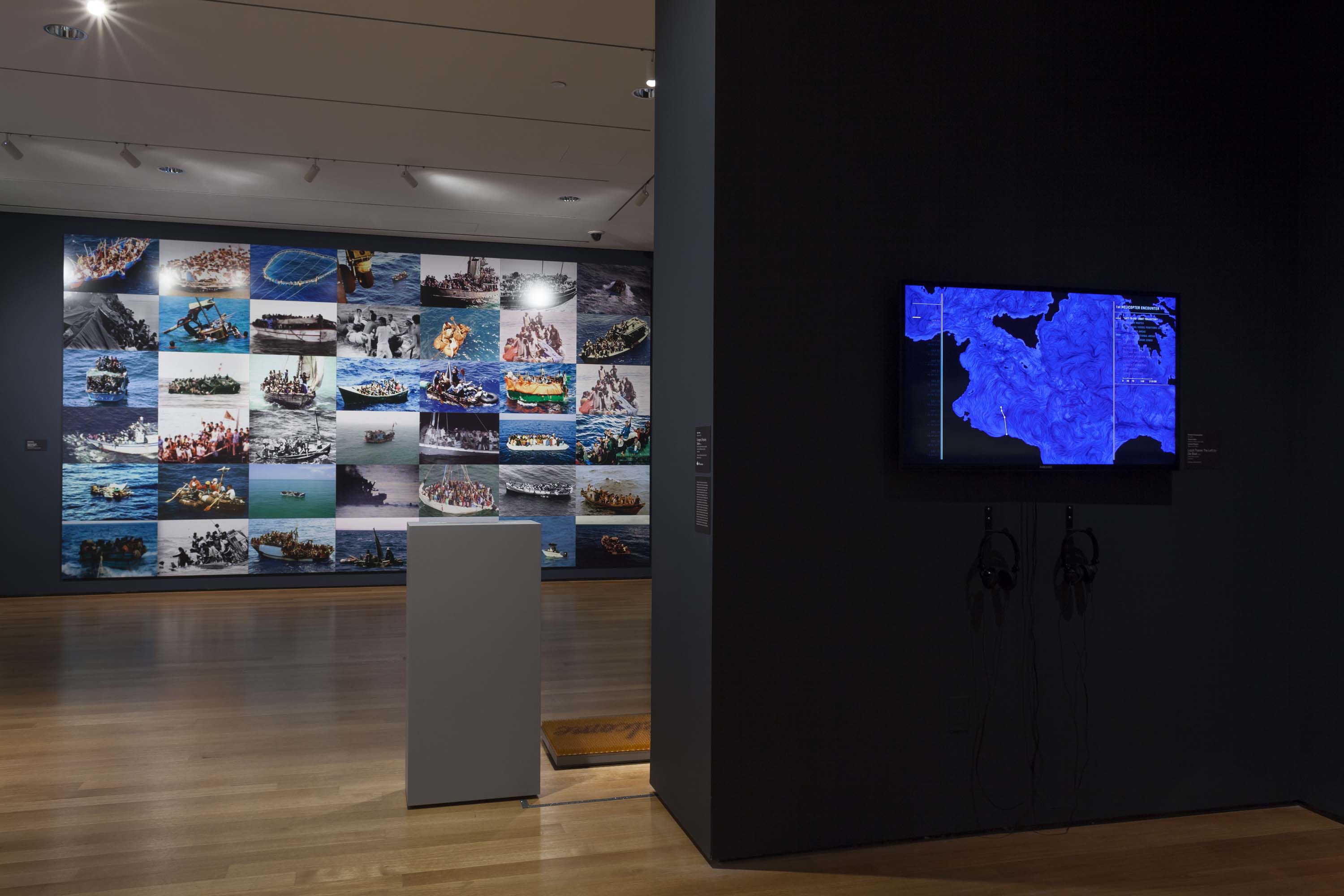 We might be made uncomfortable when, instead of luxuriating in the languorous beauty of Monet’s Water Lilies, we instead follow a similarly scaled wall piece that leads us out of the exhibition gallery into an adjacent room: United for Intercultural Action’s List of Deaths (1993–2015). This project is unflinching in its objective: to catalogue the deaths of refugees who perished as a direct result of their failed attempts to reach a place of safe haven—an inventory that includes names, dates, causes, and locations. The informational sources are manifold, and are presented as blunt, relentless statistics. The project is, by necessity, ongoing and unfinished. The viewer can, and must, fill in the details with her imagination. Perhaps this kind of activity can force us into a different form of contemplation without an easy excuse for looking away: a political act of looking.