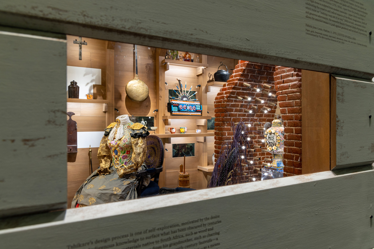 Before Yesterday We Could Fly: An Afrofuturist Period Room is a house-within-a-room located just off the Metropolitan Museum of Art’s Medieval hall. There are more than forty other period rooms on display at the Met, all of them immersive spaces that one can step into or stand on the threshold of. In contrast, viewers surround Before Yesterday, experiencing it by circling a narrow perimeter corridor, peering into the freestanding house through cutouts in its façade. Design objects, home furnishings, books, herbs, and artworks fill its deconstructed interior.