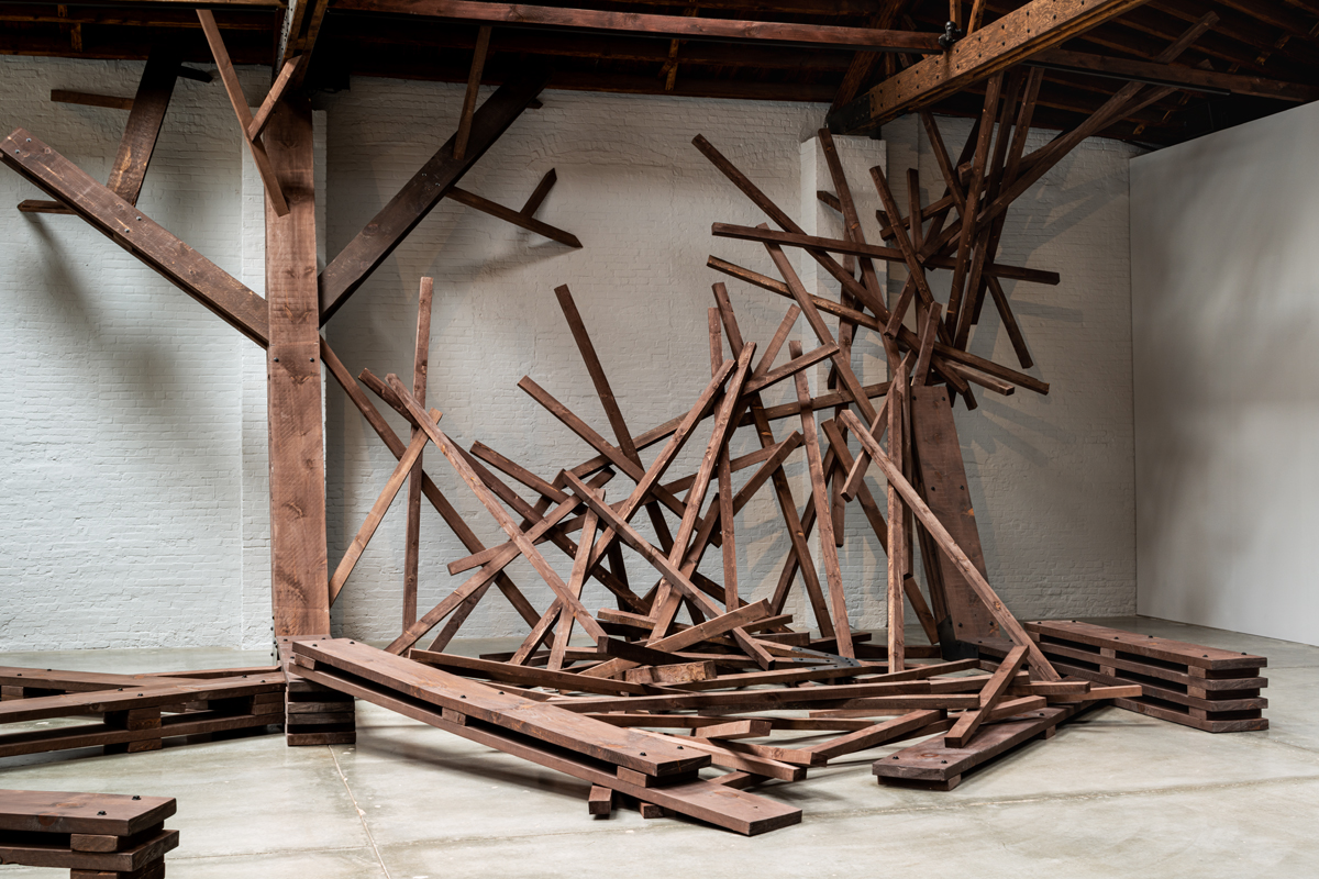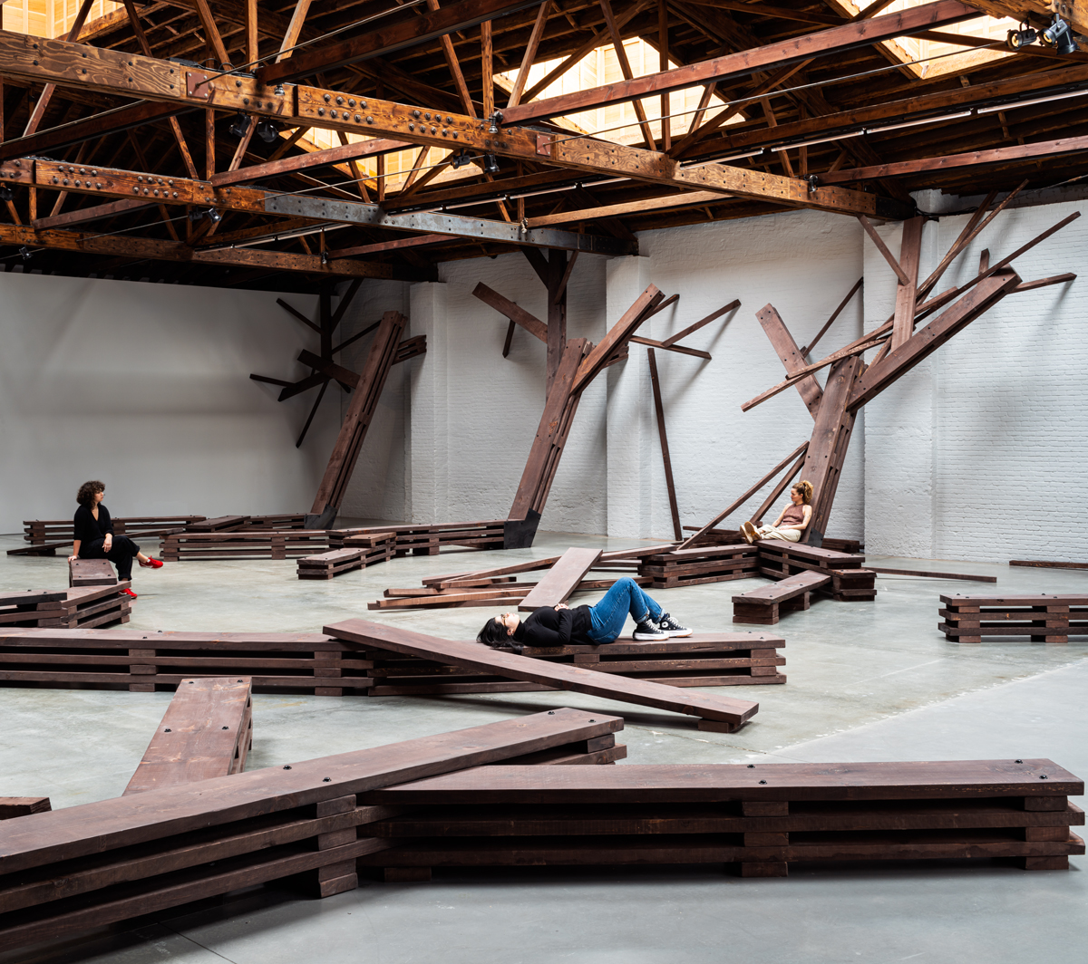 In the second room dozens of thick wooden beams branch across the walls and onto the floor, where they angle out to become benches. A half-dozen or so splintery, Y-shaped wooden forms leaning against the walls suggest broken crosses. Their formal interplay with the vaulted wooden roof brings up thoughts of how industrialization’s infrastructures and networks require standardization, while echoing a deconstructed Nordic spa.