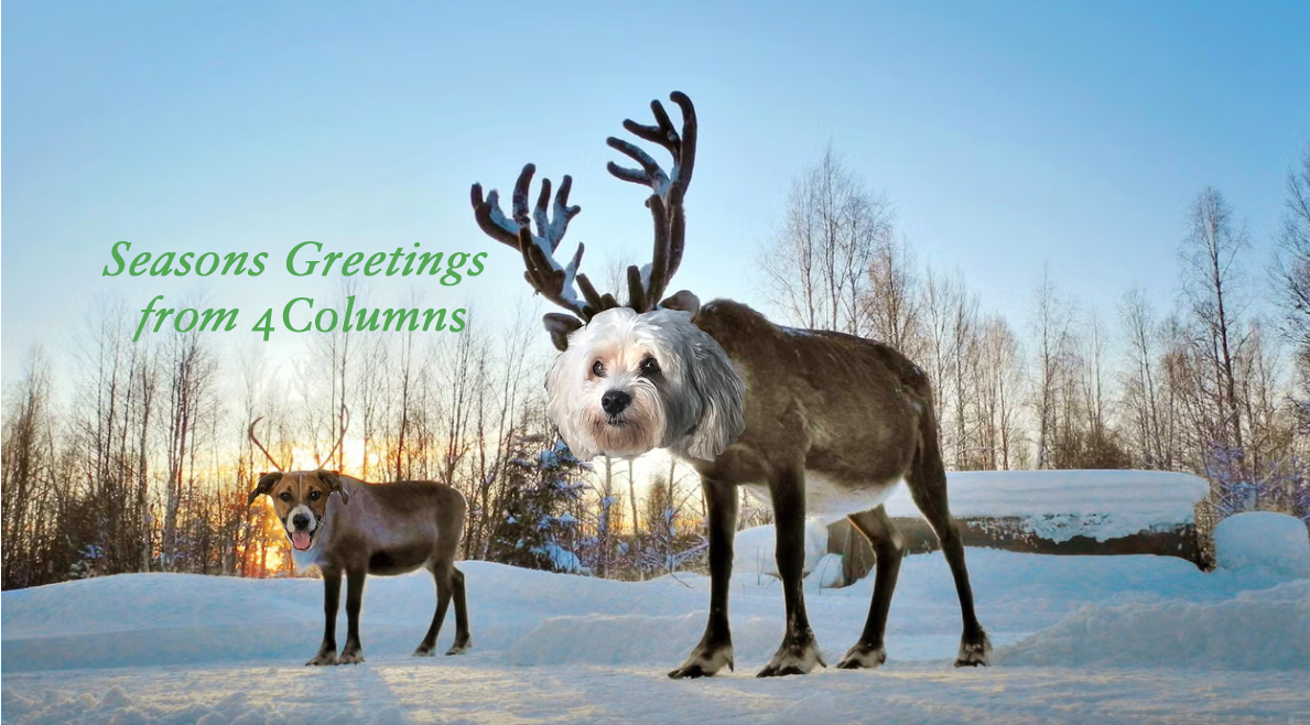4Columns assistant senior editor Bolek and mascot Sparky wishing you a happy new year from their winter friendcation.