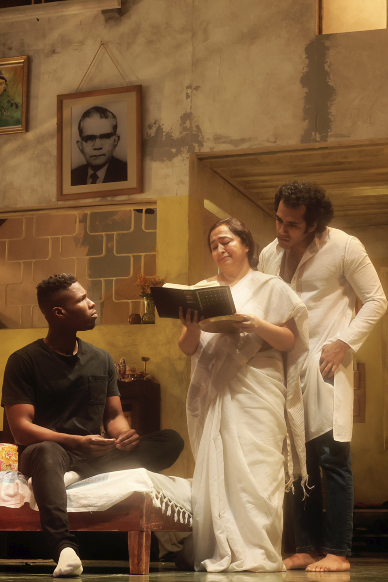 Every cast member is a vibrant presence, brimming with skill and charisma, but Haque accomplishes a particularly striking physical transformation over the play’s nourishing three hours. In early scenes, Choton’s posture is terrible; he’s forever cringing from insecurity and nerves, hunching over his phone or fidgeting at his laptop. Toward the end, as he disrobes and wraps a towel around his waist to take a shower, Choton has undergone a change. It’s something to do with Raheem’s love and patience and a sense that his grandfather had a private identity beyond the repressive taskmaster. Choton stands straight and proud, and Haque, a beautiful, muscular fellow, is an image to behold. Home he is, and not a jot homely.