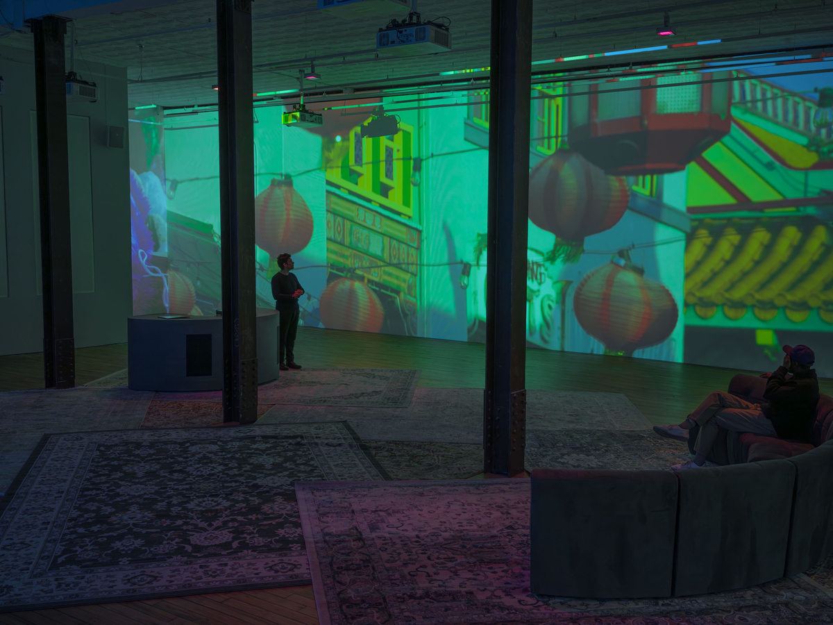 Cucolorises, contraptions used in the film industry to cast shadows or silhouettes, create non-cinematic imagery in corners and behind the DJ table. One throws a helicopter on the wall; another, based on a viral photograph by Estevan Oriol (“the Ansel Adams of LA”), presents “LA fingers”—a pair of ring-clad hands forming initials of the city. Yet another shows an Olmec head with a broad nose and lush lips—a nod to Afrocentric myths that have arisen around the possible origin of these colossal sculptures (and the Olmecs themselves) in Africa.