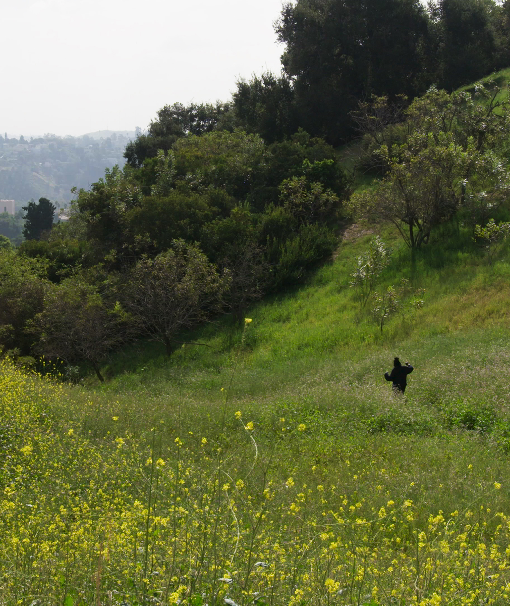 With The Wanda Coleman Songbook, the installation at the center of Cauleen Smith’s latest New York solo show, the artist has transformed 52 Walker into the ideal space for deep listening and slow looking. The floor is covered with worn carpets, the lighting is dim, warm, and inviting, and the couches are remarkably comfortable. It’s a place where you feel like shedding your coat, plopping down your bags, and settling in. Drop the needle on a thirty-two-minute vinyl on the minimalist DJ table, watch the videos projected all around you, take in the scent wafting through the gallery (a mix of grass, eucalyptus, gasoline, ocean salt, flowers, and citrus, from what I could sniff), and find yourself immersed in Smith’s vision of Los Angeles.