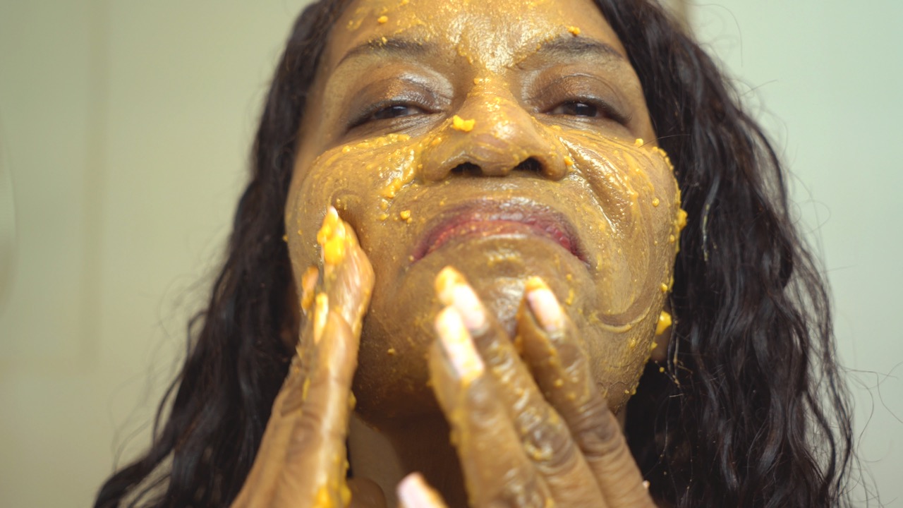The centerpiece of the exhibition is Decision Fatigue (2020). The video appears on a monitor hung on the rear wall of the first gallery, which is painted a tasteful pinky-beige. It features Harris-Babou’s mother, Sheila Harris—an elegant woman of a certain age, and a familiar presence in the artist’s work, having previously appeared in a number of her videos and performances—explaining her beauty routine, talking about her favorite skin-care products, and giving tips on spiritual and physical health. The genre is not uncommon to anyone who’s looked at woman-focused websites lately, but within seconds it’s clear what we have here is not business as usual. After cleaning off her bathroom mirror with Windex—the first step in her toilette, Harris-Babou’s mother explains—she goes through two different self-care regimens. The first involves her preparations “for not breastfeeding,” and the second, a grooming suitable “for eating a TV dinner.” Both activities are markedly out of step with Yummy Mummy dogma where lactation and “clean eating” are two of the many, many pillars of civilized, bourgeois, and largely white femininity.