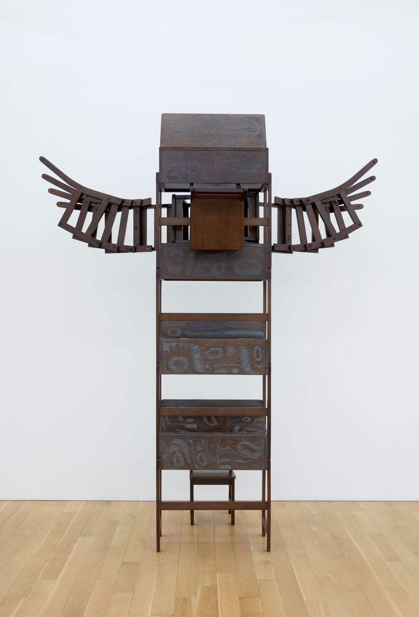 Bearing the weight of this history, the visual impact of Loom’s diminutive furniture hits you like a punch in the gut. But look closely at the surfaces and you will see something remarkable, even hopeful and defiant: the desks’ sides and hinged tops are covered with formlines—curvilinear shapes familiar in Northwest Coast Indian art—that trace out simplified animal heads and hands and eyes, like bored doodles of generations of students. The existence of these marks is proof that despite their best, most evil efforts, despite the deplorable loss of life, residential schools failed in their ultimate purpose: there continue to be artists like Galanin, trained in the methods and techniques of their ancestors, who have their cultures flowing through them.