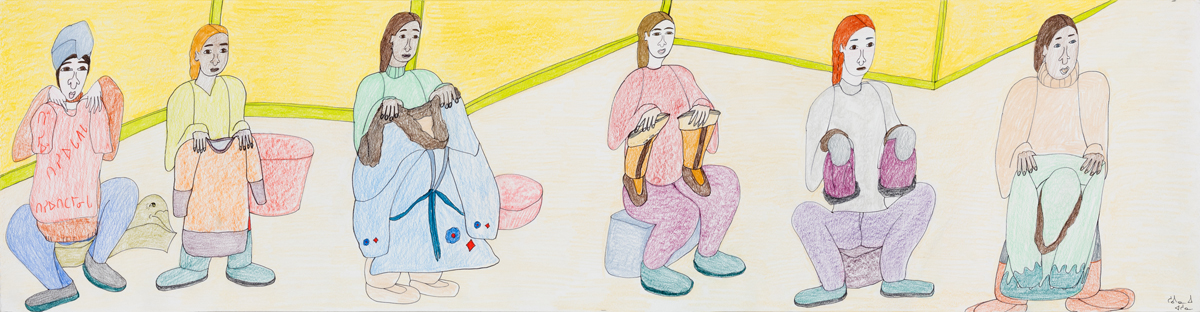 Shuvinai Ashoona, Holding what they made in town, 2022–23. Colored pencil and ink on paper, 13 × 50 inches. Courtesy the artist and Fort Gansevoort. © Shuvinai Ashoona.