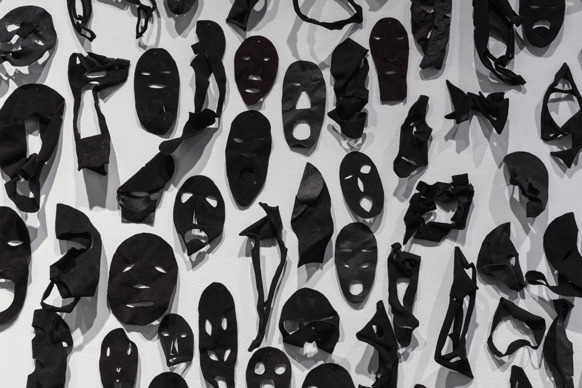 As much as individuality is insisted upon, so is collectivity. The Civil Rights protesters depicted by Thomas, for example, found their strength in numbers. In a canny curatorial move, next to her drawings is a piece, both tender and eerie, by Tennessee-based artist Alicia Henry. Analogous III (2020) is made up of three hundred or so faces, fashioned from leather, sometimes embellished with thread and paint. They are assorted sizes and shapes, and the leather is treated in different ways (dyed, soaked, air-dried), producing varied tonalities and causing them to curl and buckle irregularly. Eyes and noses and mouths are cut out crudely, yet carefully, so that the faces seem both masklike (in other words, obscuring identity) and decidedly particular. The cutouts are grouped on the wall in a manner that suggests movement—like a parade, or a procession (perhaps a funeral procession?), or a march.