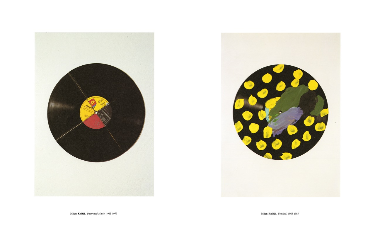 The book takes its name—and inspiration—from a series of chaotic, transformational works by Knížák. “In 1965 I started to destroy records: scratch them, punch holes in them, break them,” he writes in the book. “By playing them over and over again (which destroyed the needle and often the record player too) an entirely new music was created—unexpected, nerve-racking and aggressive. Compositions lasting one second or almost infinitely long (as when the needle got stuck in a deep groove and played the same phrase over and over again). I developed the system further. I began sticking tapes on top of records, painting over them, burning them, cutting them up and gluing parts of different records back together, etc to achieve the widest possible variety of sounds.”