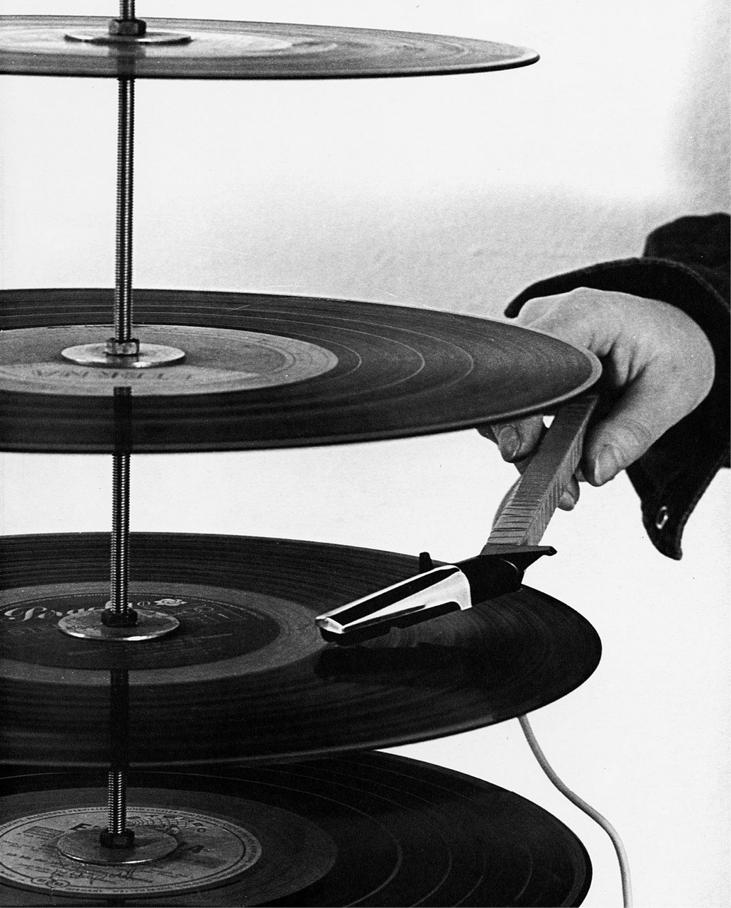 The estimable Brooklyn publisher Primary Information recently issued a meticulous recreation of the rare book. All of the original details have been faithfully replicated, right down to the attached vinyl flexidisc of one of Czech artist-musician Milan Knížák’s startling sound collages, performed by the Arditti String Quartet. The first half of the book includes reprinted essays by luminaries such as Theodor Adorno, László Moholy-Nagy, and Jean Dubuffet, and the text is simultaneously presented in German, French, and English translations. The second half is a lengthy annotated index of hundreds of records and works by artists and musicians. Some, but not all, of these entries are adorned with helpful explanatory text and numerous lush images (including John Cage’s geometric graphic score for Imaginary Landscape No. 5; Joseph Beuys’s eerie sculptures of gramophones festooned with bones and blood sausage; and an expansive floor installation by Christian Marclay, One Thousand Records, at gelbe Musik in 1988.)