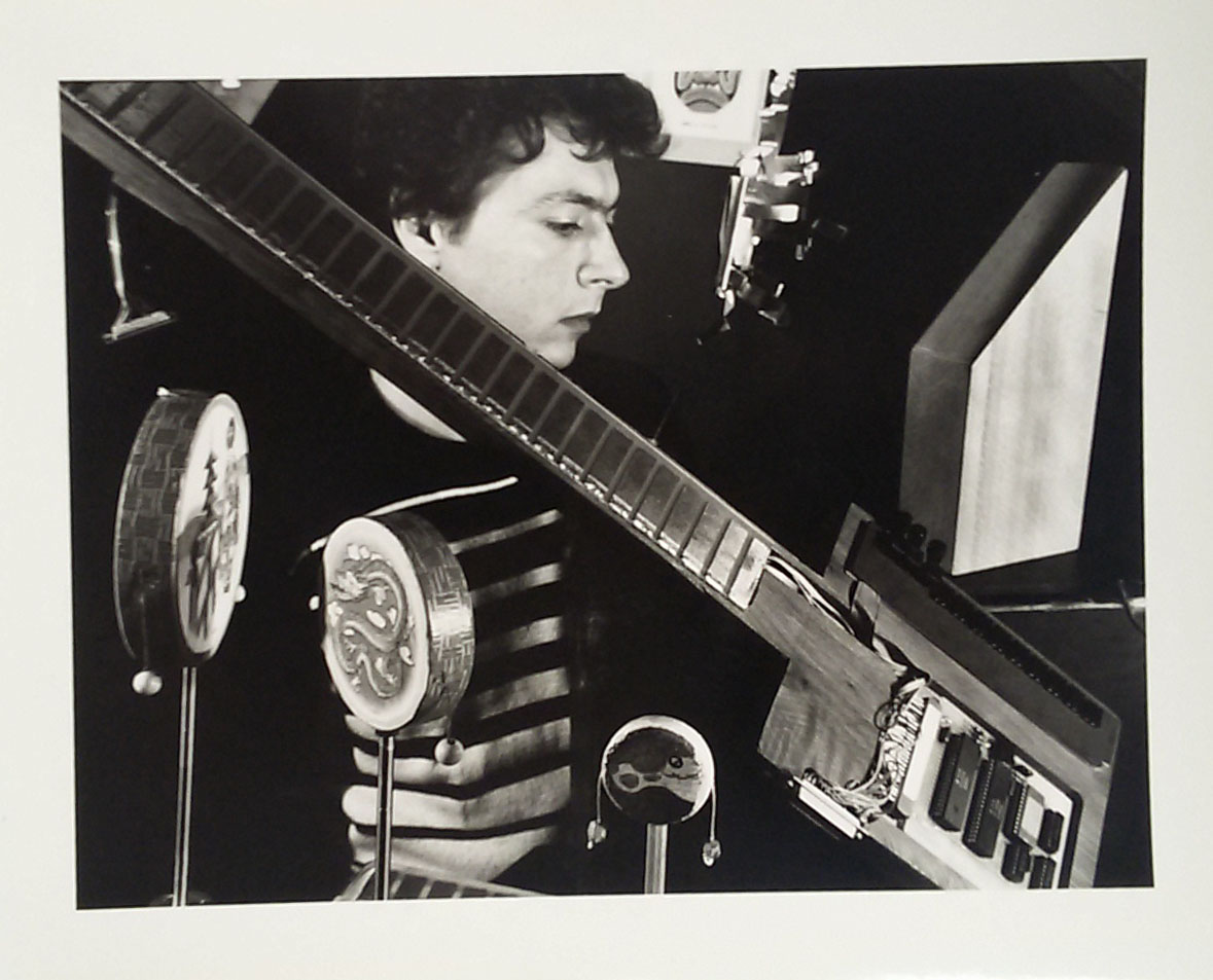Paul DeMarinis performing at Mills College, 1979. Photo: Maggi Payne. (Speak & Spell is visible in lower right-hand corner.)
