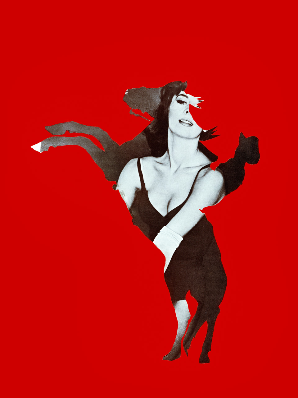 Charlesworth frequently altered images she found in books and magazines in response to the graphic designer’s sometimes hilarious sequencing. Consider the small, dazzling Cibachrome, Rider (1983–84). Against a vermilion background, the unmistakably masculine silhouette of a cowboy on a rearing horse frames a black-and-white glamour shot. Likely Natalie Wood, en décolletage, the image followed the cowboy picture in a magazine. Charlesworth applied the same Chinese red to the lacquered wood frame, and to three other similarly sized works (all 1983–84). Together, they herald, and here stand in for, the Objects of Desire.