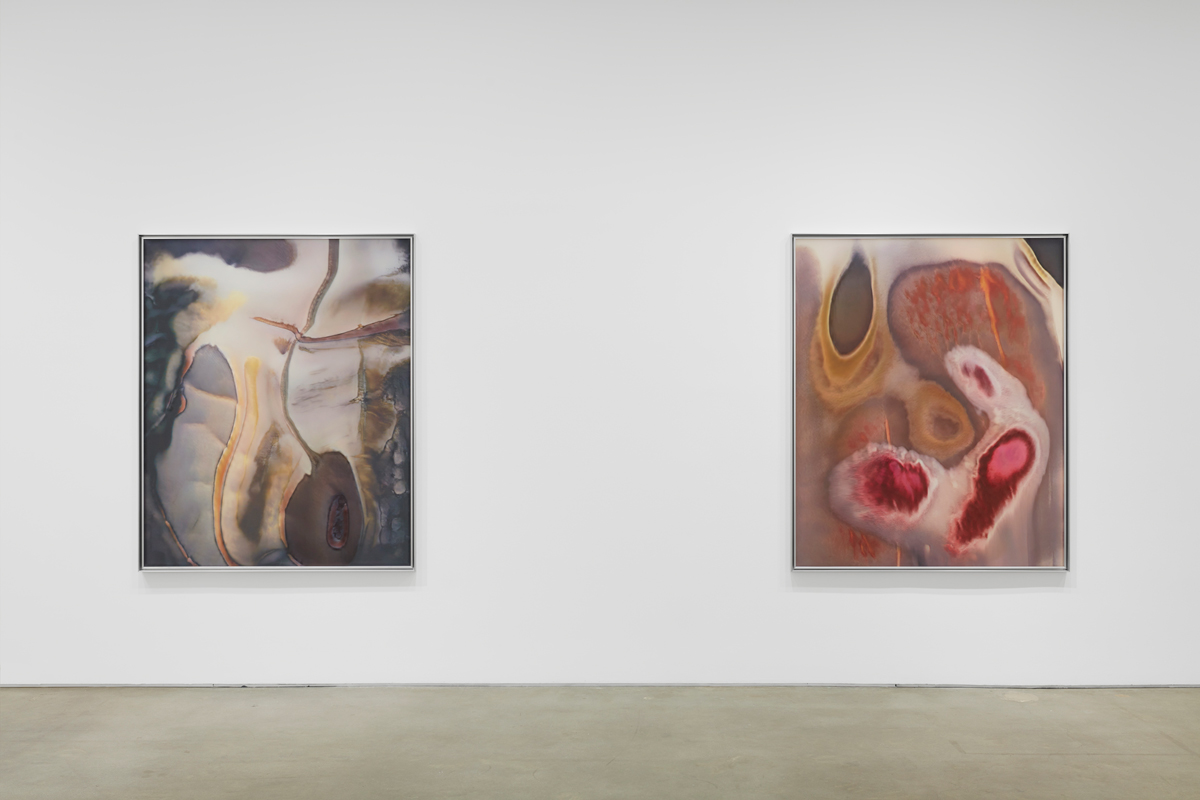 I know what she means, but I’d answer, thinking of her career, that she already has: in previous painting-like works, the artist has used unstable, organic ingredients rather than representing them. Her Hugo Boss Prize exhibition, Life Is Cheap, at the Guggenheim in 2017 included an installation of agar gel tiles blooming with cultured bacteria, its samples collected from sites in Chinatown and Koreatown in Manhattan. In her survey Metaspore, which closed in August, at the Milanese postindustrial space Pirelli HangarBicocca, hanging slablike vitrines of local soil nodded to the landscape genre, drawing horizon lines and mountain ranges with serendipitously shaped swaths of colonizing microbes. It’s true, though, that ÄLñ§ñ engages more explicitly with specific historical styles (Abstract Expressionism and biomorphic abstraction, especially); in moments, canonical varieties of painterly beauty parallel the visual magnificence of biological minutiae—the pathos of petri-dish, tide-pool, or intracellular events.