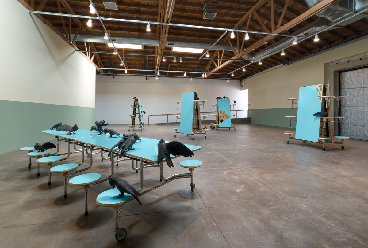 The answers came quickly. Titled You Can Paint Over Me But I’ll Still Be Here (2021), the work features five blue tables with hard seating that’s immediately recognizable from school cafeterias. A scattering of cartoonish figures set on these furnishings are as familiar, and both attendant and preteen swiftly agreed on a number of personality types at hand. There is the grandstanding class clown, for example, in addition to the social clique huddled among themselves; and then there is, high in the gallery’s rafters, the watchful introvert, looking down upon this hectic scene. Their shared intuitive understanding of such lunchroom dynamics emphasizes just how much institutionalized settings are formative sites of collective memories and learned behaviors that shape our subjectivities.