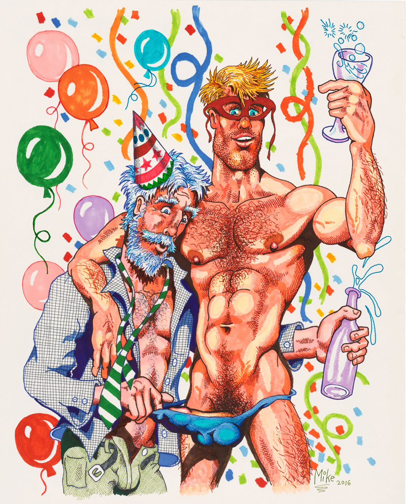 Here, in a show simply titled Drawings by Mike!, are twenty-two neatly framed ink-and-felt-tip-pen cartoons of tousle-haired Caucasian bohunks engaged in a variety of joyously, nakedly homoerotic situations: skinny dipping, crotch grabbing, pec rubbing, tit sucking. Their bare asses are, without exception, spheric and shiny, like the juiciest apple you’d ever hope to bite. Their sparkling eyes appear glazed over, staring into daydreams even as the men lick and paw at one another’s brawny bodies. Their expressive dicks are thick and veiny: some half-tumescent flesh-tubes flop lazily downward; others stab at the air, yearning toward some object of desire, dribbling semen like a salivating predator.