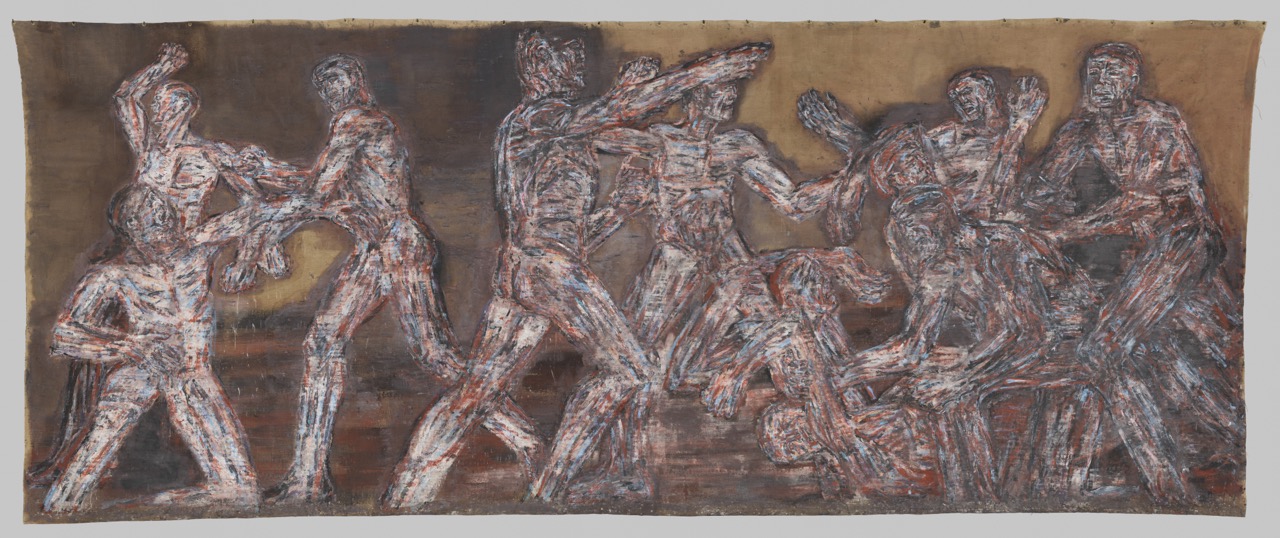 Leon Golub, Gigantomachy II, 1966. Acrylic on linen, 9 feet 11 ½ inches × 24 feet 10 ½ inches. © The Nancy Spero and Leon Golub Foundation for the Arts, licensed by VAGA.