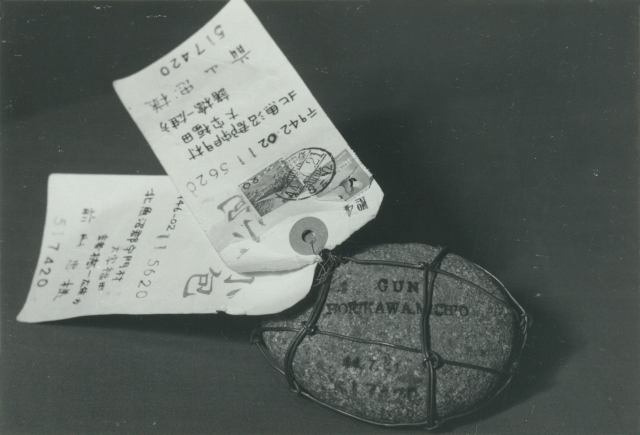 Horikawa Michio began his Shinano River Plan in 1969, in Niigata, Japan, a mountainous landscape far from Tokyo’s metropolis. To execute his work, Horikawa collected eleven stones from the banks of the Shinano River—Japan’s longest—and wrapped them in wire, which allowed him to affix address, message, and postage, and send his stones to a select group of recipients. (To form his own collection, Horikawa photographed the specimens before shipping them out.) A selection of these objects resurfaced at Japan Society in New York last spring as part of Radicalism in the Wilderness: Japanese Artists in the Global 1960s, the groundbreaking exhibition curated by Reiko Tomii.