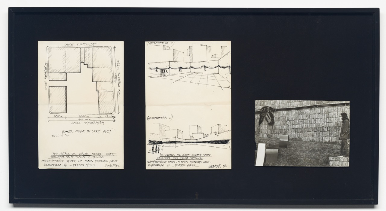 Horacio Zabala, 300 Meters of Black Tape to Mourn a Public Square, 1972. Ink on paper and gelatin silver print, 19 6/16 × 36 1/4 inches. Courtesy the artist and Herlitzka + Faria. Photo: Arturo Sánchez.