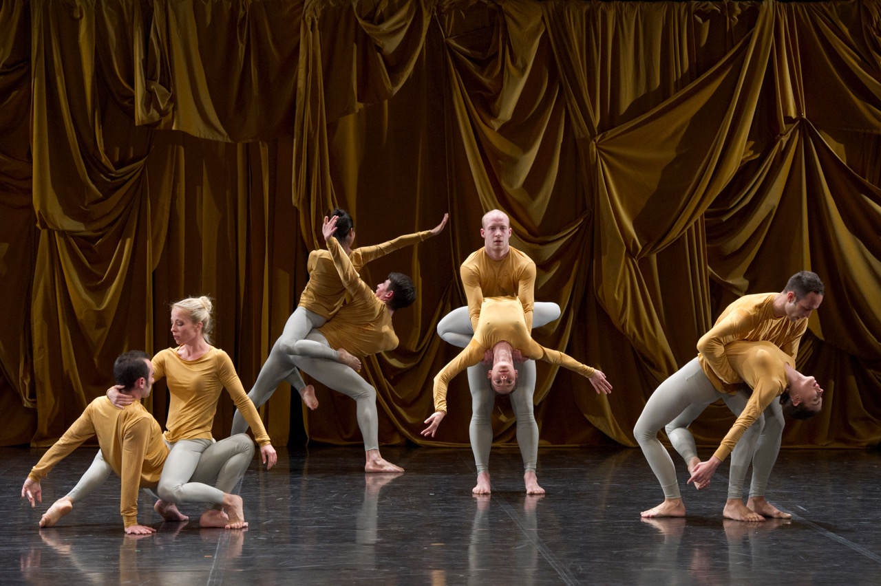 The third dance, set to a spare piano score—later on, there were strings—was a soulless exercise in partnering for three couples who revealed the pros and cons of being in relationships with a dull display of tangling and untangling limbs. At least the fourth dance went somewhere: the cast, wearing shimmering yellow Lycra—evocative of the costumes in Merce Cunningham’s Sounddance—performed classroom exercises under stark fluorescent lights. Gradually their steps, also reminiscent of Cunningham’s, began to blur and crumple, and the dancers, falling off balance as if air was being siphoned from their bodies, slumped onto the stage.