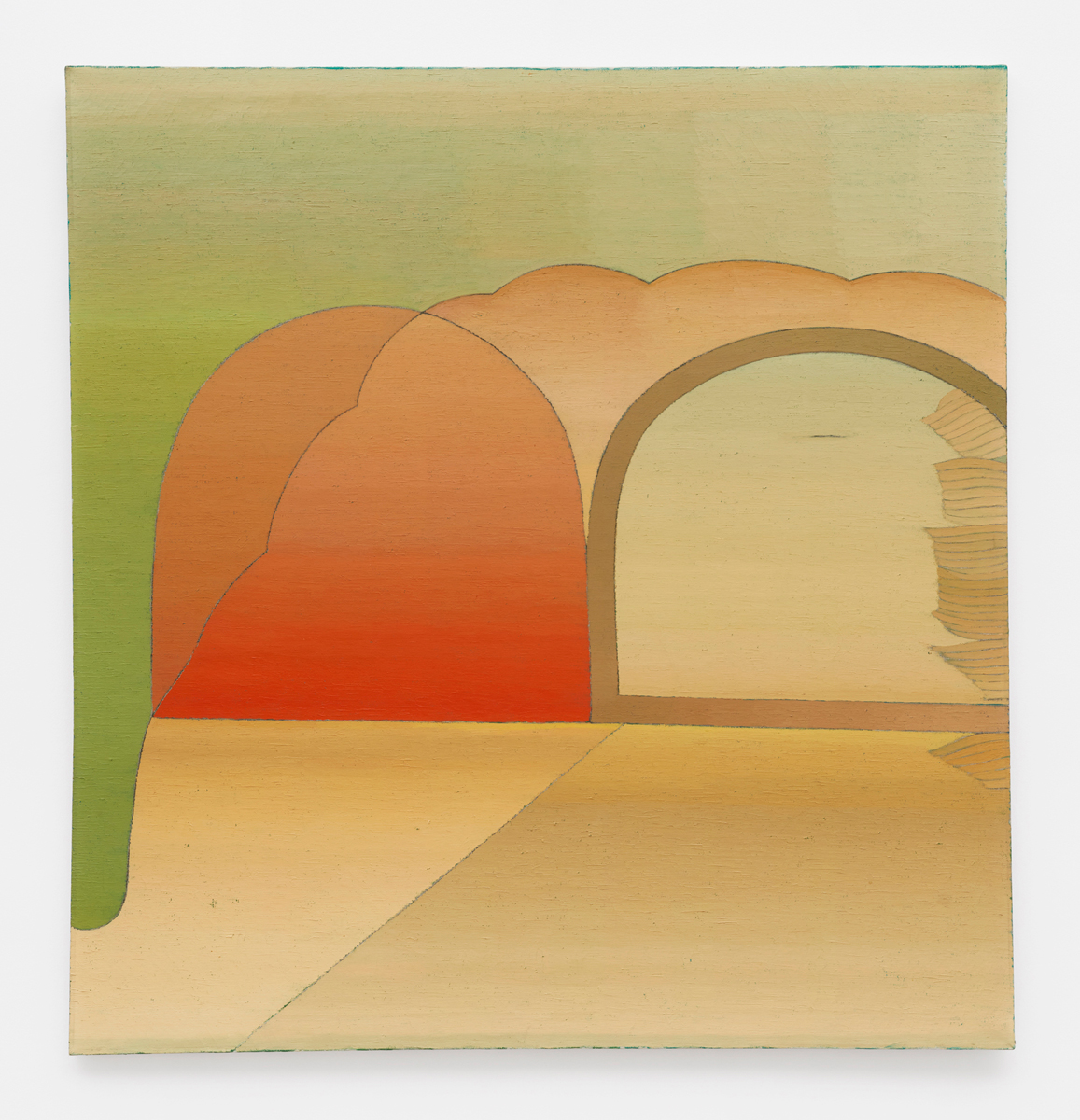There are no other works on view from the 1960s, which leaves a gaping hole in the show’s albeit very informal narrative arc. Its timeline picks up again with three canvases dated 1970—two are Untitled, the third, Untitled #126—that land viewers at the height of Ito’s prowess. By then, she was painting otherworldly constructions—or are they excavations?—that draw in equal measure from architectural elements and the natural world. One question these compositions call to mind over and over again: What, if anything, distinguishes the interior from the exterior? In the trio of paintings from 1970, she plays with a common form, the arch, which you can look in, look at, and look through, sometimes all at once. In Sea Chest (1972), the arch becomes both window and mirror, bleeding one world into the next. The following year’s Heart of Hearts, Basking (1973) is a showstopper of the highest order, leaving behind the delights of such visual gamesmanship in favor of a purer experience of space. There is only a there there—which is, to this eye, the highest achievement of abstraction.