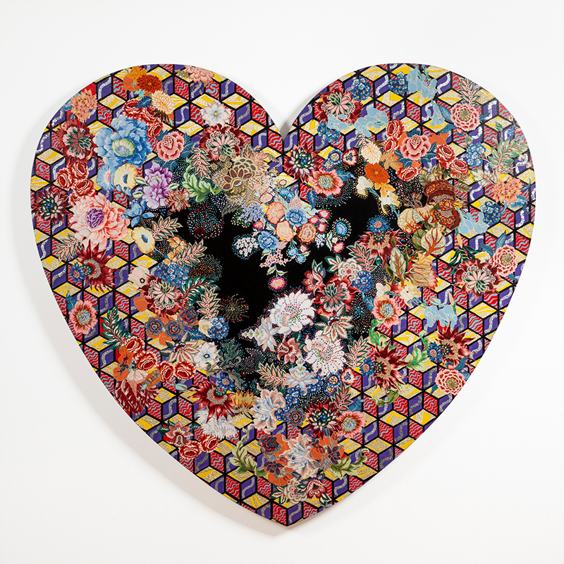 Miriam Schapiro, Heartland, 1985. Acrylic and fabric on canvas, 85 × 94 inches. © 2021 Estate of Miriam Schapiro / Artists Rights Society (ARS), New York. Photo: Zach Stovall.