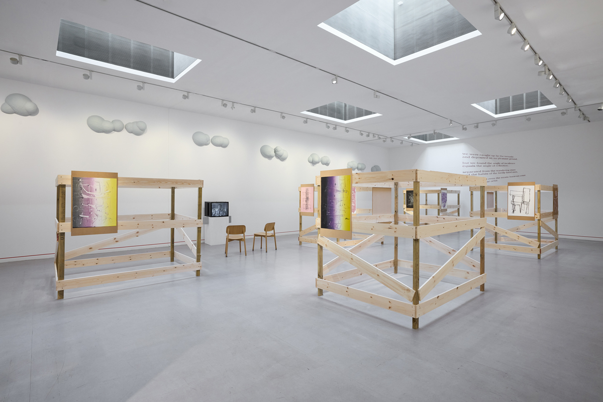 Gregg Bordowitz: There: a Feeling, installation view. Courtesy Camden Art Centre. Photo: Luke Walker. Pictured, upper wall: Baroque Clouds, 2018–ongoing.