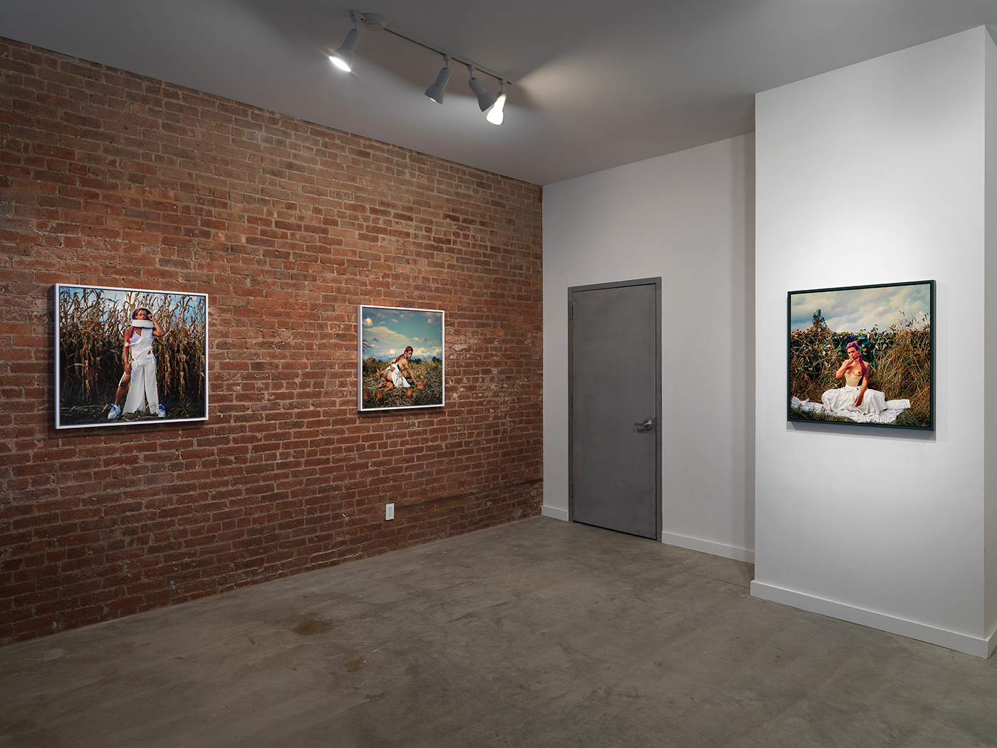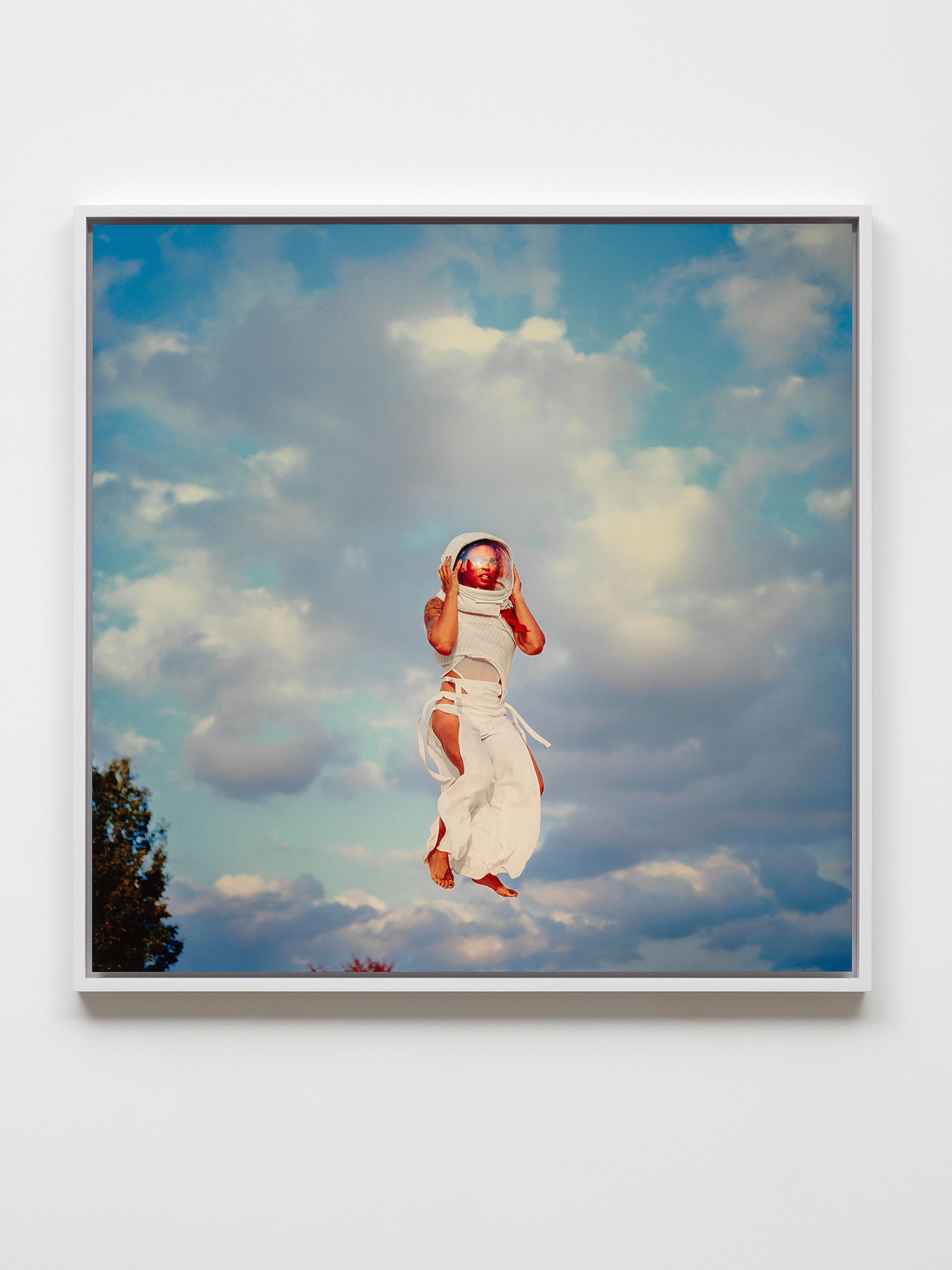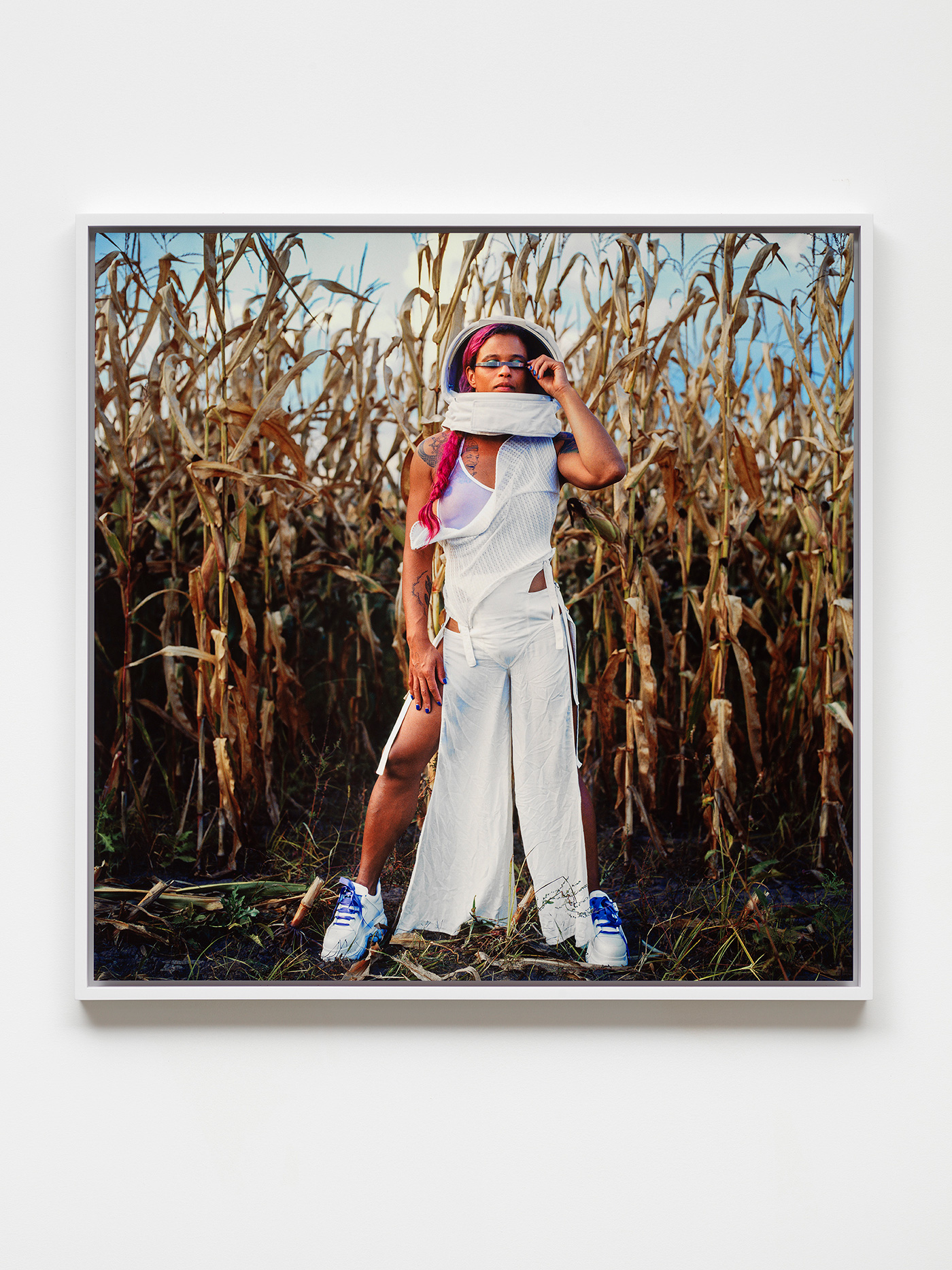 In her photography, though, Tourmaline is her own valiant subject, appearing mid-air against a prophetic sky in Summer Azure. She is holding a helmet on her head, ready for movement. But it’s unclear if her bare feet are perching or springing, if she’s going up or down. Coral Hairstreak has her in the midst of corn husks, fuchsia-pink hair braided down one side, standing in a deconstructed spacesuit, kept together by loose harnesses, and blue-laced platform sneakers, an obvious nod to Afrofuturism. In Sleepy Orange Sulphur, Swallowtail, and Morning Cloak, she’s wearing—or not wearing—an undercut corset, with an oversized cloak billowing about. Caught up in her own erotics, the artist reclines in Swallowtail, with pearls reminiscent of those Jones wore in Salacia. Morning Cloak is the most arresting: the artist, crouching among green and brown foliage, holds her right hand up to her mouth; she sucks in her cheeks, her torso almost hovering over the ground.