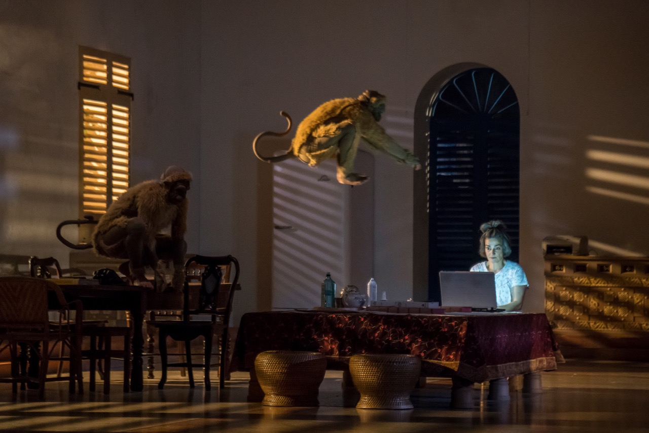 Yet even knowing that, even having seen Les Éphémères and others, A Room in India at the Park Avenue Armory seems like a cabinet flung wide. Countless elements are jumbled together in a sometimes-glorious, sometimes-infuriating choreography: a director’s-nightmare scenario about a Mnouchkine figure thrust into leadership of a theater company; an Indian troupe performing excerpts from the Mahabharata; magical visitations by acrobatic “monkeys”; dream scenes with Chekhov and Shakespeare; the real YouTube video of a bloodied Syrian child; and a Punch ’n Judy blow-’em-up gag starring seven Taliban stumblebums.