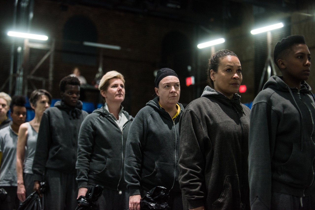 Lloyd’s trio of productions have been imagined as enrichment-program performances in a women’s prison: the action in all three takes place on its basketball court, with the all-female acting ensemble as “detainees” playing in costumes made from their jailhouse scrubs. (This has the effect of partway erasing, or at least somewhat neutralizing, gender to begin with.) Plastic bottles are the main source of props, and whenever the action gets too rough—say, a character threatens suicide—officers bum-rush the company, pin the women to the ground, and shout them into submission.