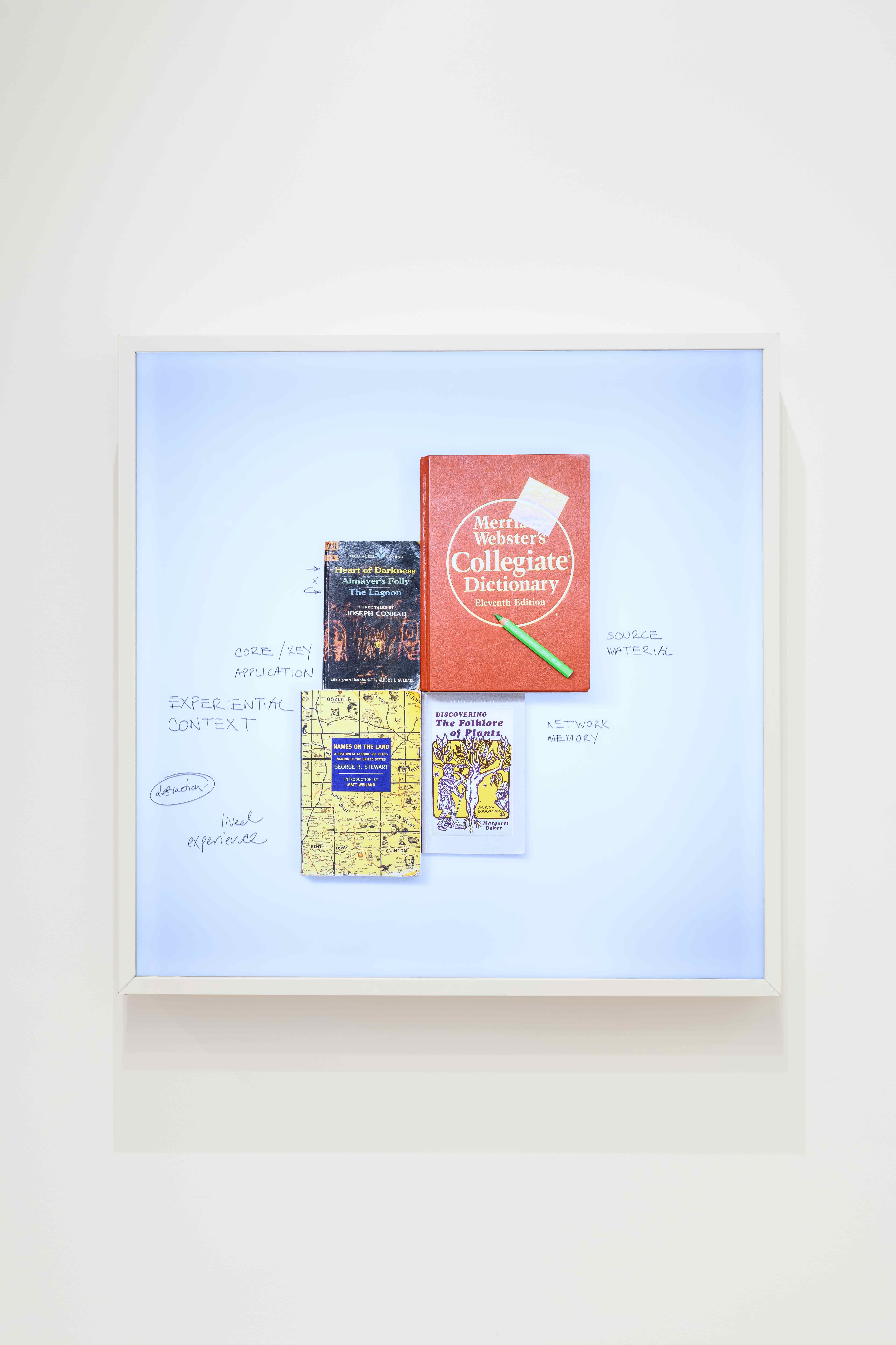 The exhibition is installed in one room, half-painted a dusky rose. First: mounted to the wall to the left of the entrance is a large, torso-sized lightbox, INDEX (2021), that suggests an interpretive structure for the series that follows. It illuminates a photograph of four books arranged in the composition’s center, in an asymmetrical grid: George R. Stewart’s Names on the Land: A Historical Account of Place-Naming in the United States; three tales by Joseph Conrad, among them Heart of Darkness; the eleventh edition of Merriam-Webster’s Collegiate Dictionary; and Margaret Baker’s Discover the Folklore of Plants. Written in the margins is an oblique taxonomy of what’s inside the volumes: lived experience, abstraction, experiential context; core/key application; source material; network memory.