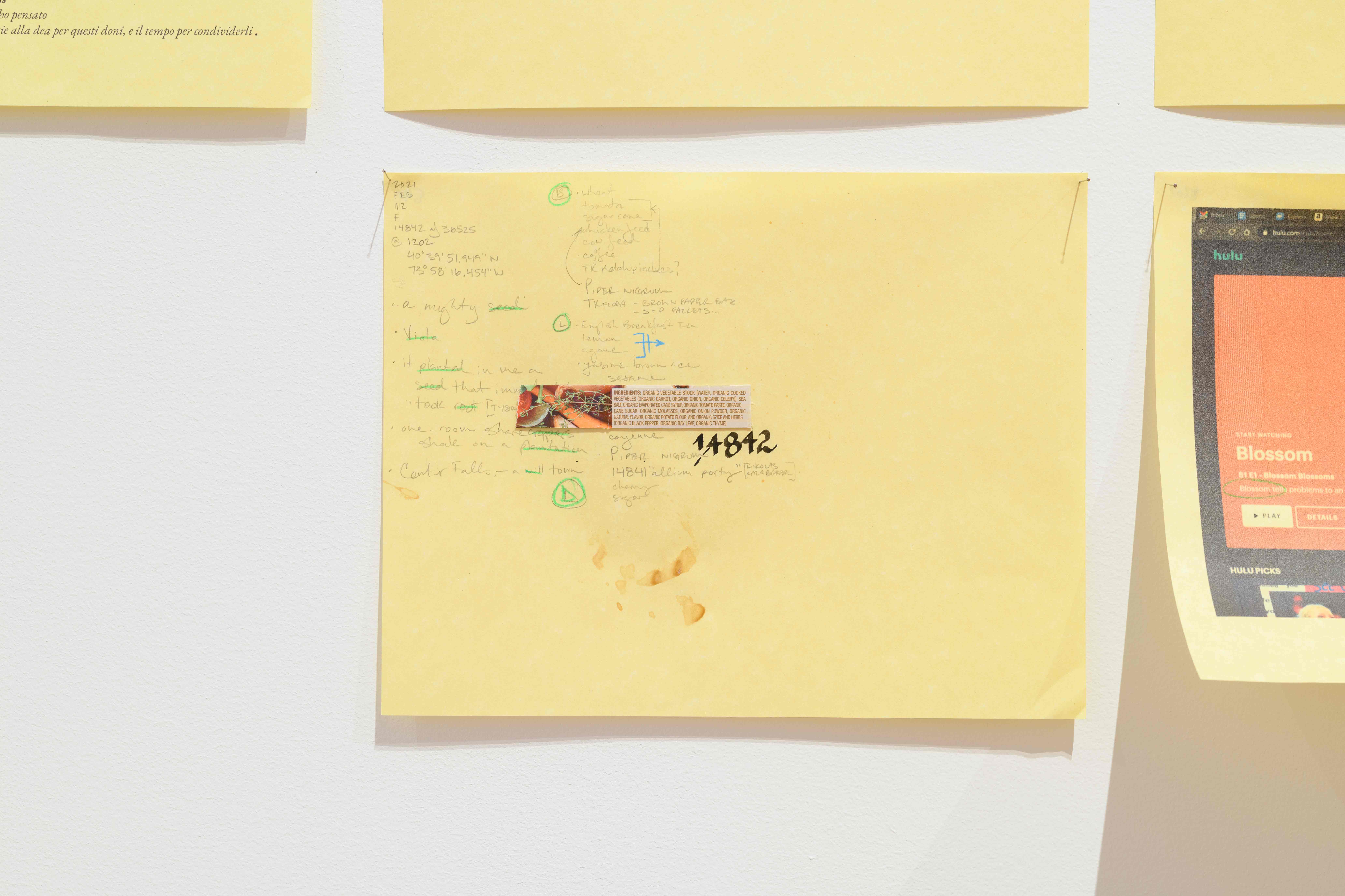 In her writings, Greaves quotes bell hooks inveighing against how women of color who compose theory are dismissed if their writing is too clear, not adequately obfuscated by academic jargon and arcane references. But Greaves also quotes Fred Moten’s advancing of “the anarchic organization of phonic substance [that delineates] an ontological field wherein black radicalism is set to work,” and Kevin Young’s argument for aliteracy, “a trickster-style technique that . . . provides a system beyond which one can be defined, even by writing.” Greaves’s work jags between these poles of readability. At Artists Space, she offers specimens both hermetic and plain. On several yellow sheets, she lists in faint pencil the Latin names of plants, recipes, ingredients, and she minutely sketches botanically accurate, identifiable foliage. (And facts: like that, when very thirsty, trees have been found to scream. I recognized this line from Peter Wohlleben’s The Hidden Life of Trees, where he explains that, when deprived of water, the tree trunk emits ultrasonic vibrations; it is “crying out” at a level far above human hearing.)