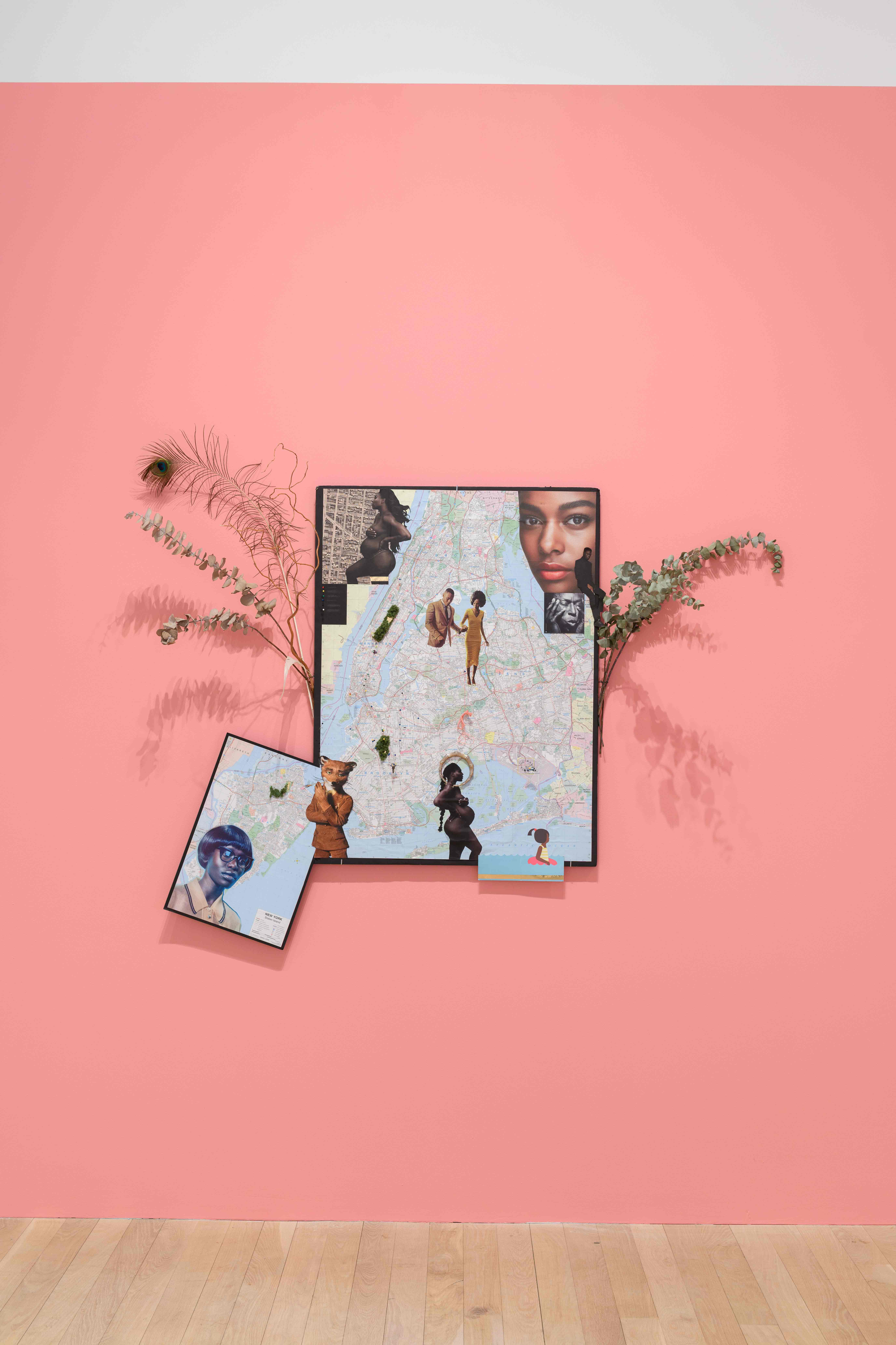 Strings of alphanumeric coordinates appear on a few of the pages, too. I plug one set into Google Maps; that day, Greaves had been in Brooklyn’s Prospect Park, by the doggie beach. Near the show’s end, you can trace where she has lived, found joy, found violence, found “interbeing” across the five boroughs of New York City, each instance marked with pins, on a map collaged with greenery, a feather, magazine cutouts (Autotelemachy, 2017). She allows the viewer to surveil her, to track the data of her being’s time and place. But the details defy construal.