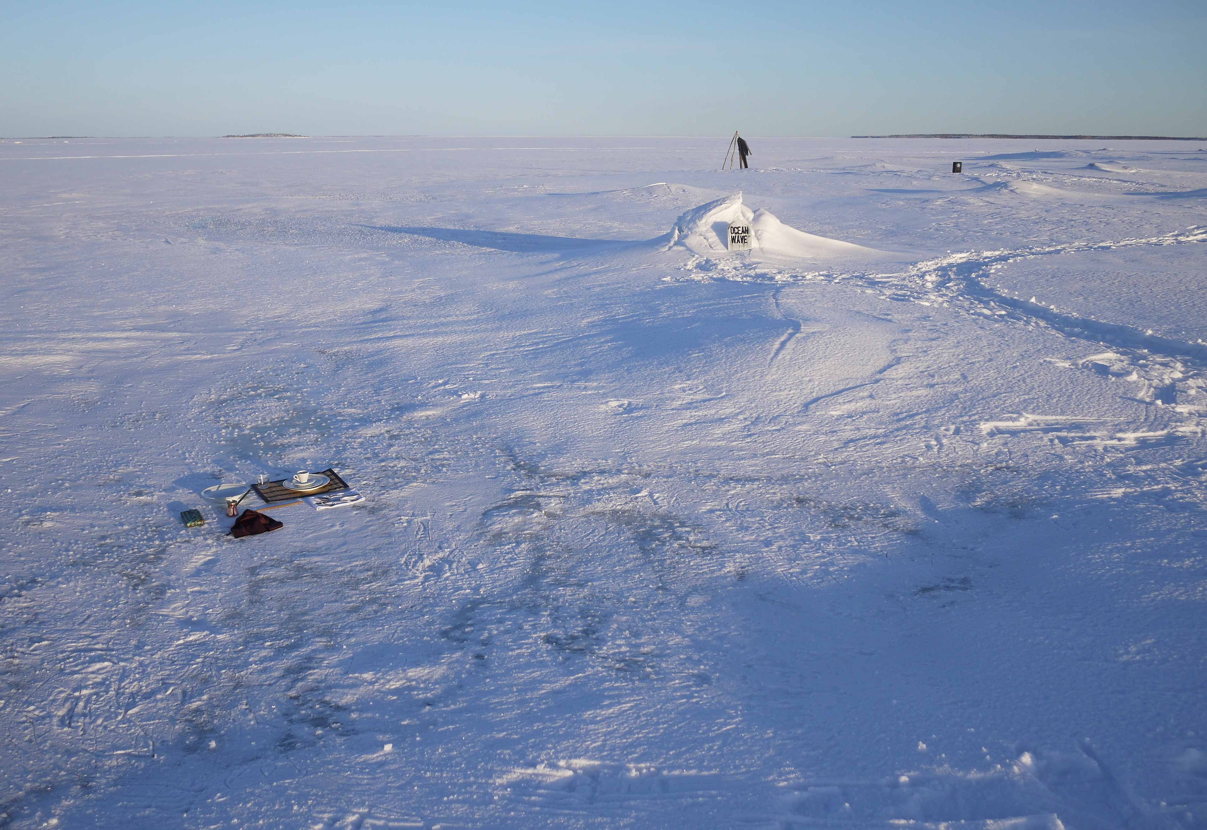 Goodbye, World, curated by Andreas Templin and Raimar Stange, apexart international exhibition located on an ice floe in the Bay of Bothnia, Swedish Lapland (and online here), on view until the ice melts
