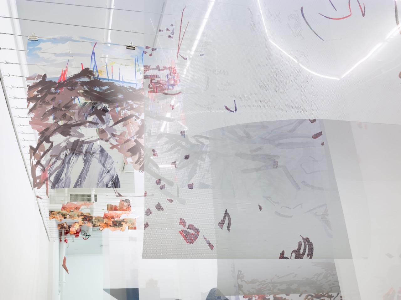 This is also to say that the work is hard to see. In the first room, facing the installation head-on, the thickly opaque sheets block the ones behind; only a few layers can be glimpsed at once. The sheets are hung close together, so that one has to crane and peer to view the images printed on them. Or they are hung so high up that one has to concentrate to make them out. I found myself using the camera on my phone to gaze bionically, zooming in through my screen on details that were difficult to otherwise descry. The images in question make up a field of isolated painterly gestures: a commotion of shaky lines on one panel, a smudge of repeated marks made using a special Photoshop brush on another. Some layers are simply flooded with color: a hit of toxic orange or strip of lucent blue. There are also found photos manipulated in different ways—grayscaled clusters of roses, a collaged wall of rocks. Passing through the room, all the different marks and icons come in and out of focus, merge and separate in your field of vision.