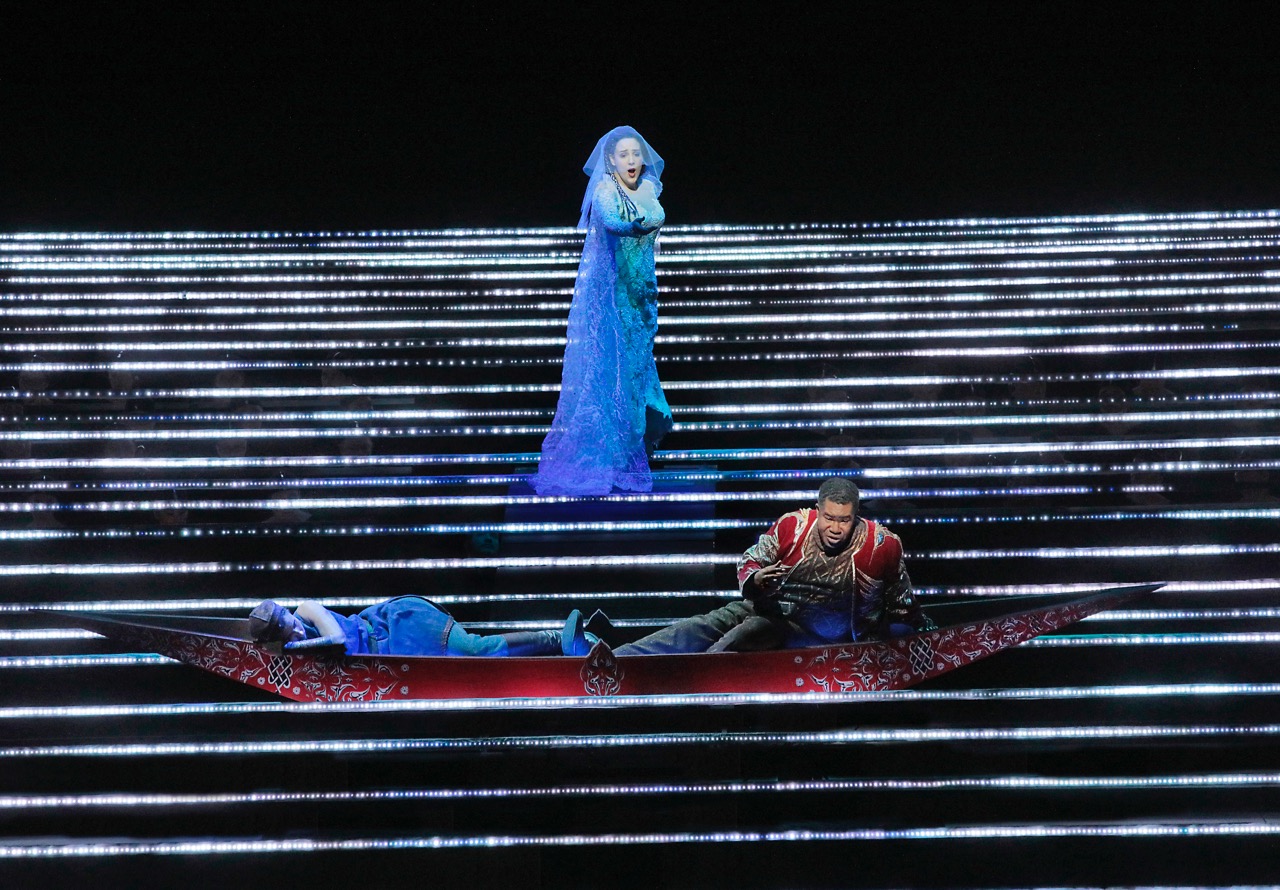 The biggest drawback of the production stemmed from the singers’ restricted ability to move about—a limitation all but dictated by the narrow, horizontal strips of ground between the strings of LED lights. For most of the evening, the characters were hoisted and twirled around, above that field of lights, on a large, swiveling machine that looked like a cross between a ship’s gangway and some platform on a movie spaceship. In Owens’s first scenes, he seemed a bit less powerful than I remembered him from past engagements, and I feared that Lepage’s intricate staging was cramping the singer’s style. Fortunately, before the first act was over, his performance had stabilized.